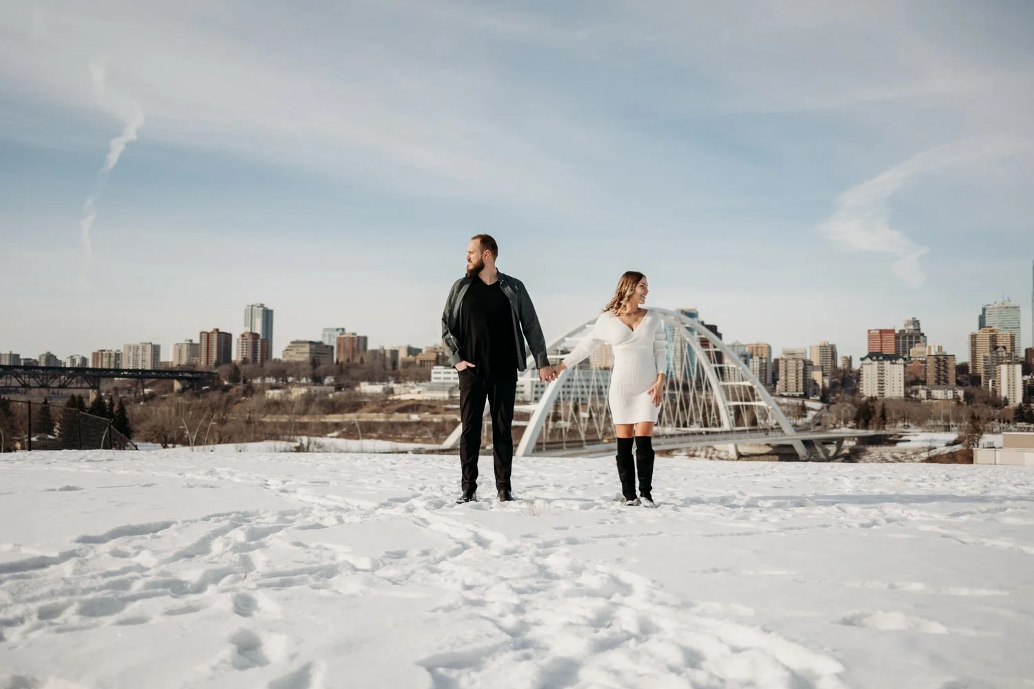 N + G are one of my lovely 2023 wedding photography clients and they decided to take their complimentary engagement session into the heart of downtown Edmonton, Alberta with the Walterdale Bridge as their backdrop! ALL of my wedding photography packages include a complimentary engagement session; I believe these are a fantastic way for us to get to know each other, get a feel for your style and get you and your partner comfortable in front of the camera so it’s not so daunting on your wedding day!